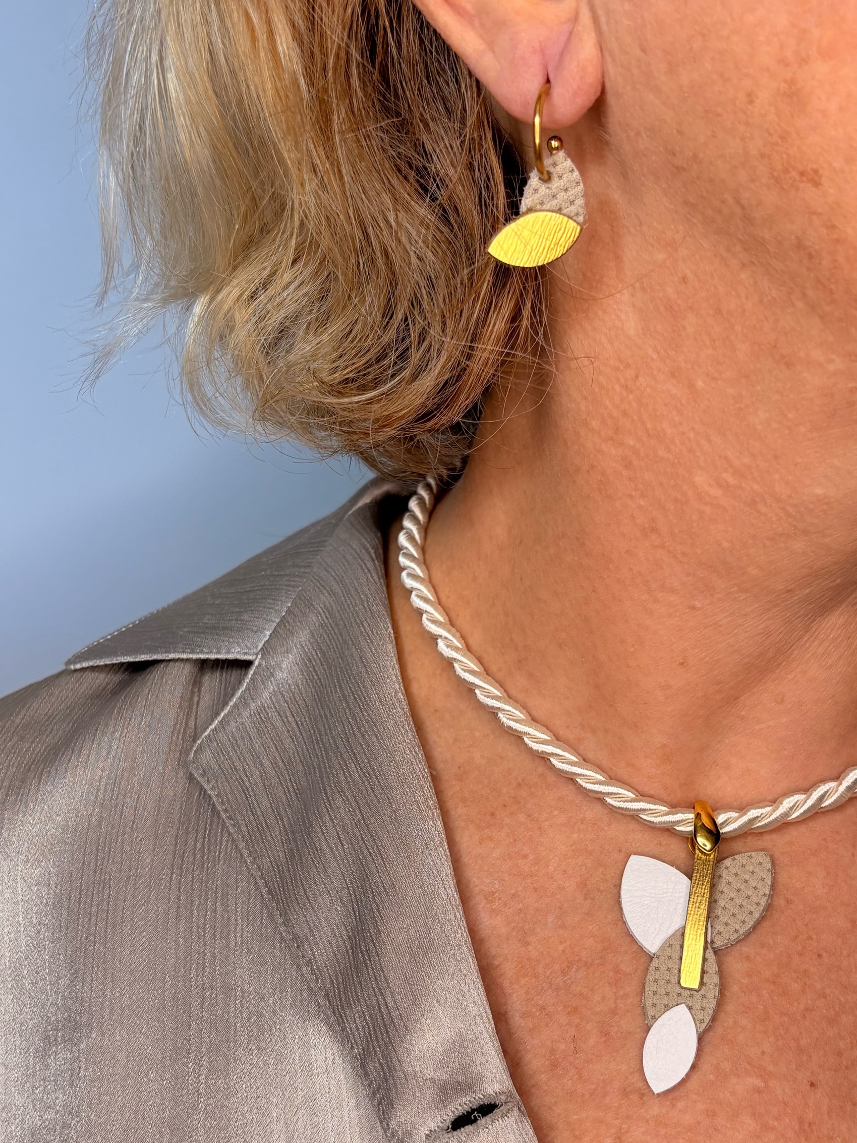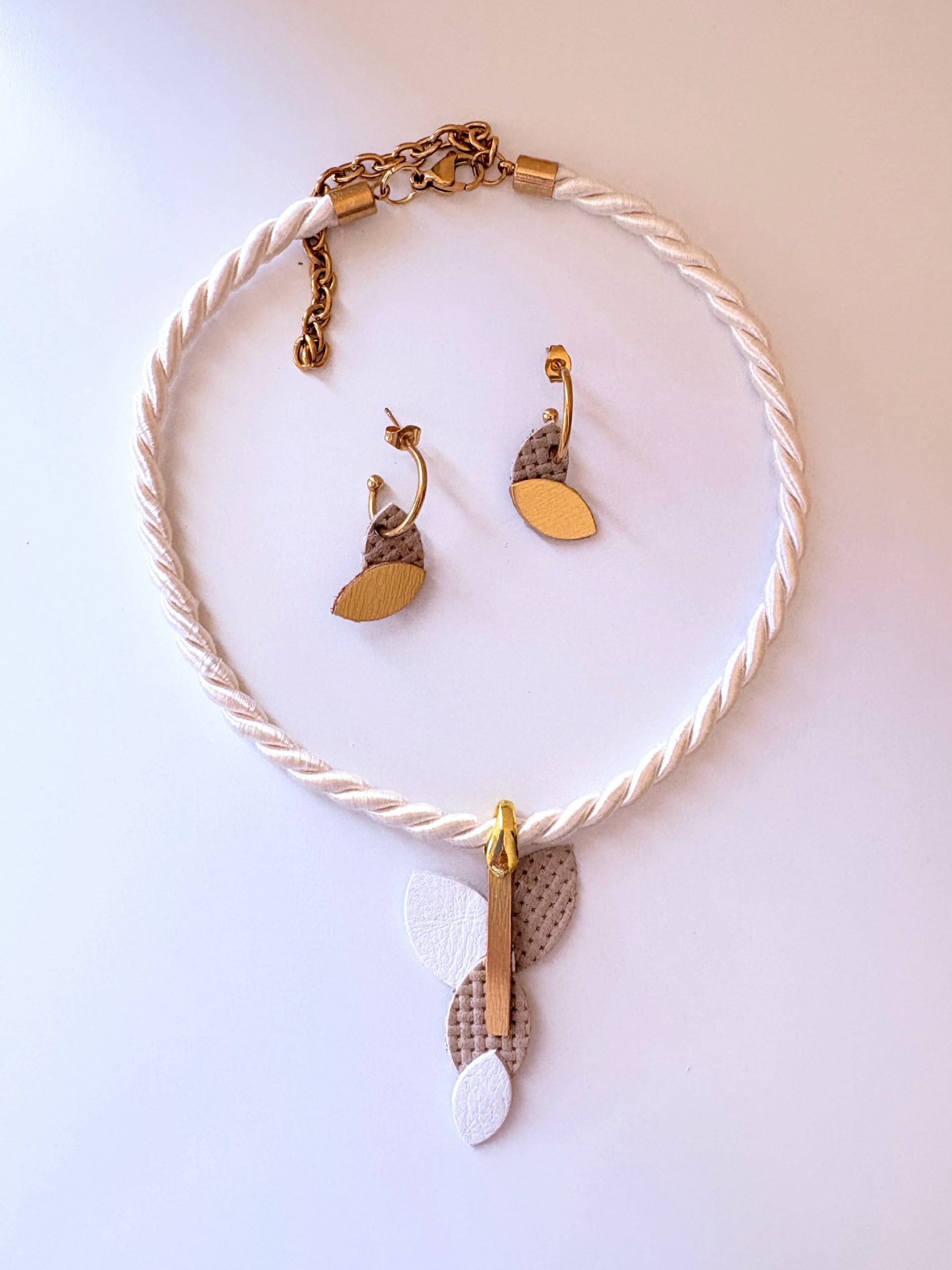 Confeccionados a mano en piel blanco y café, estos pendientes y colgante de la colección de Otoño «Asimétrica» son una oda al otoño, desde una perspectiva abstracta y exclusiva que caracteriza a nuestra marca.