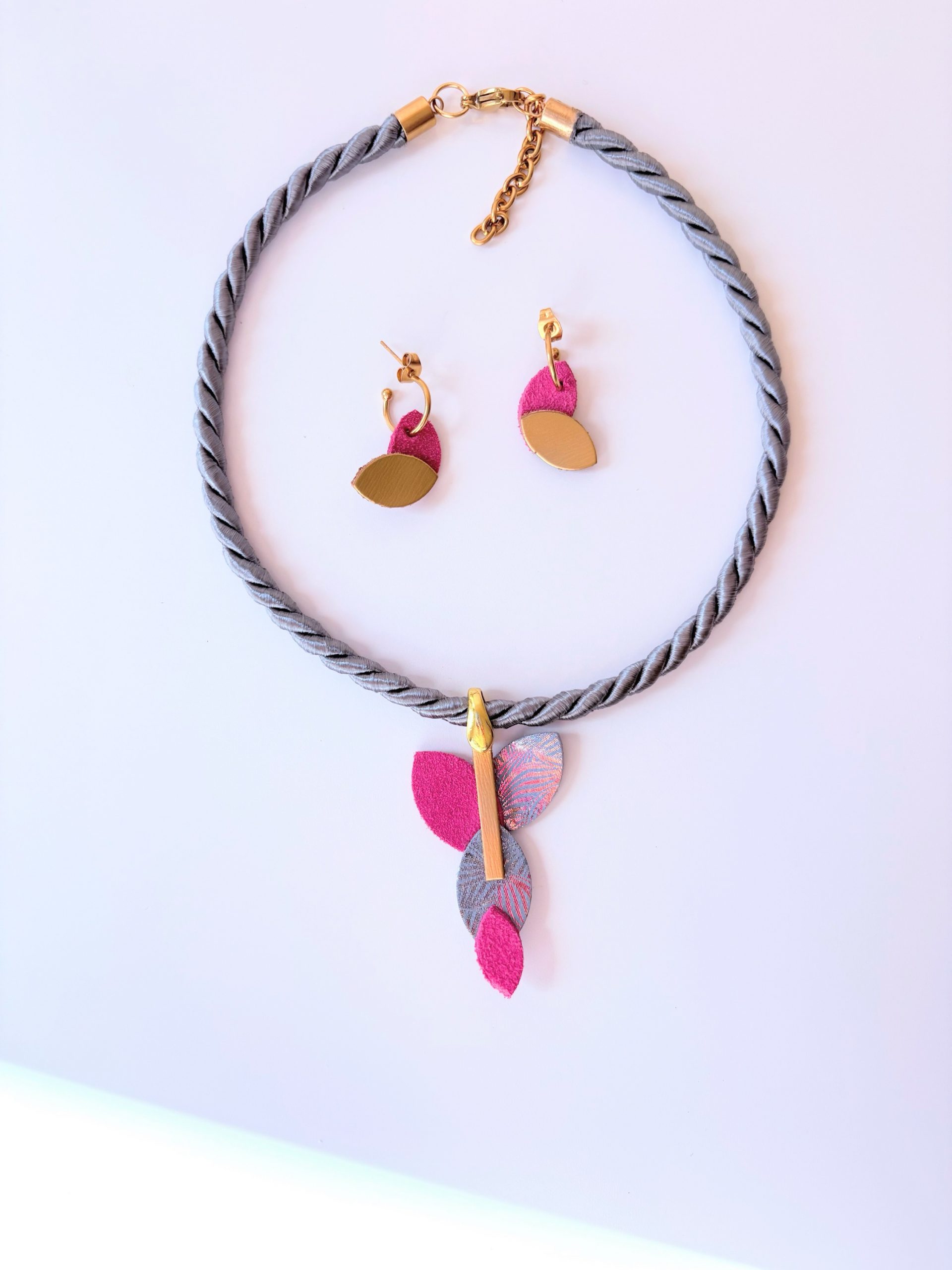 Conjunto de diseño en piel en tonos fucsia y grisáceo, ligeros, elegantes e ideales para lucir en cualquier ocasión. Se adaptan a cualquier look y a cualquier edad, realmente llevarás una pieza única. Hecho a mano en España.