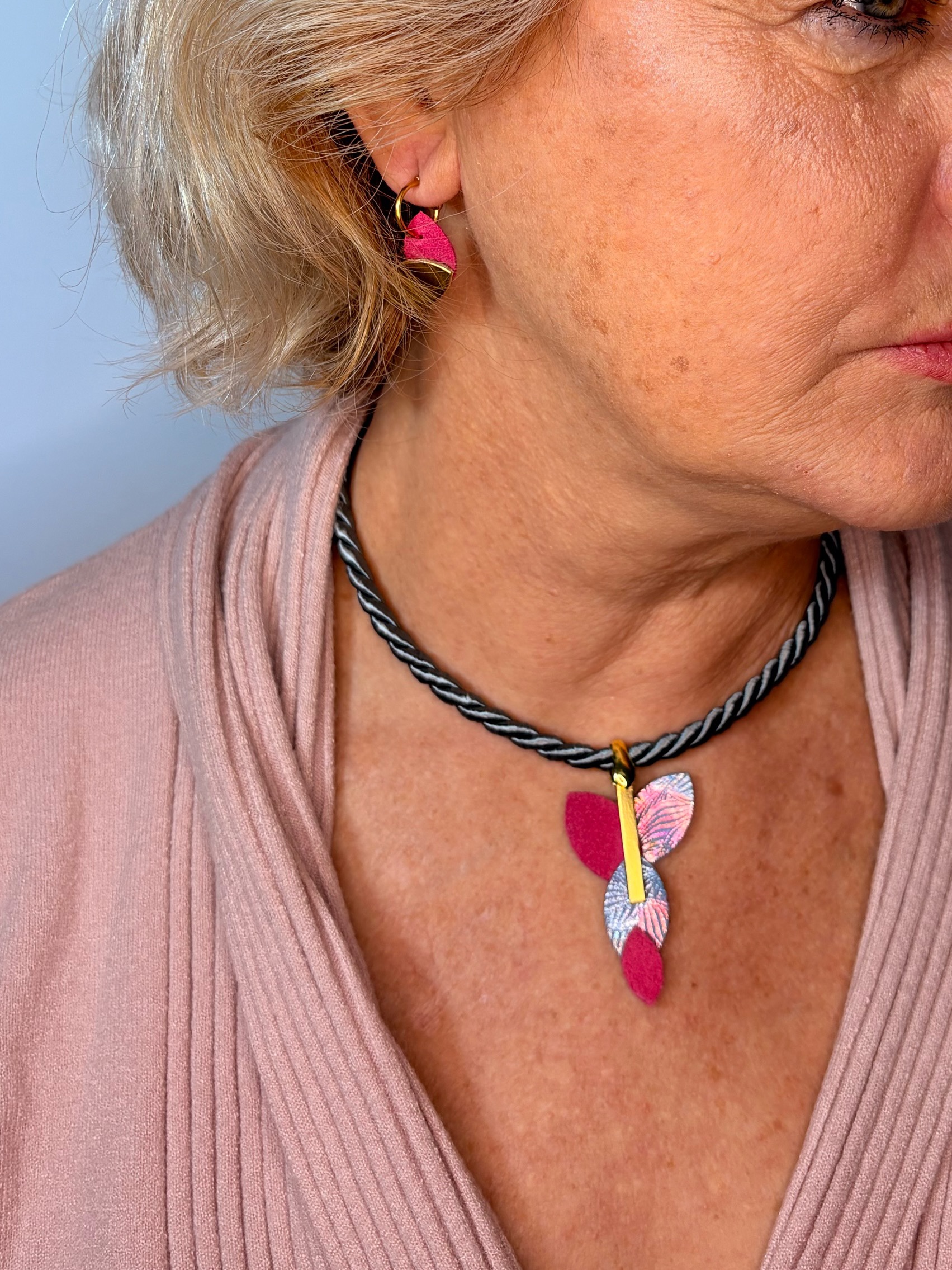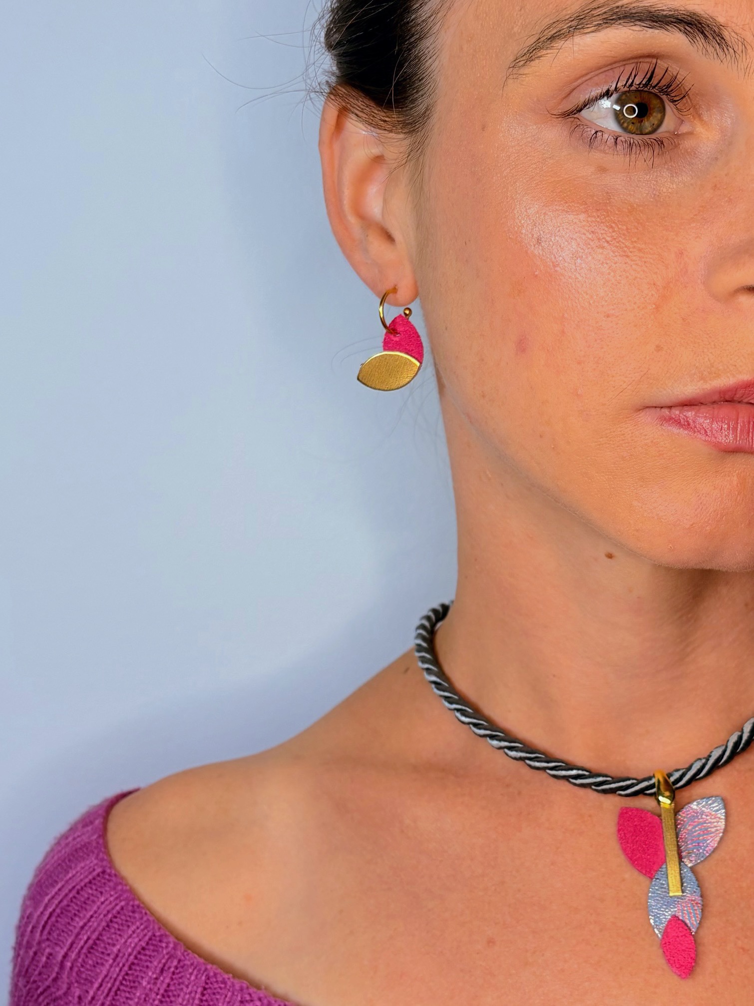 Confeccionados a mano en piel fucsia y gris estampado, estos pendientes y colgante de la colección de Otoño «Asimétrica» son una oda al otoño, desde una perspectiva abstracta y exclusiva que caracteriza a nuestra marca.