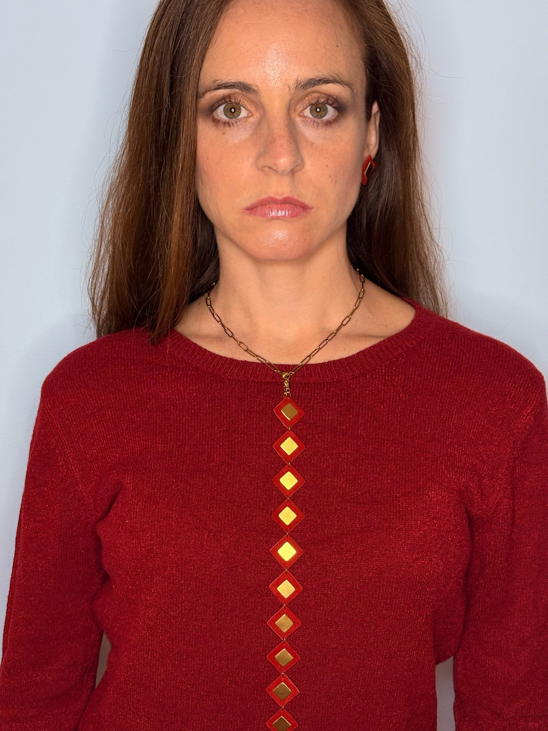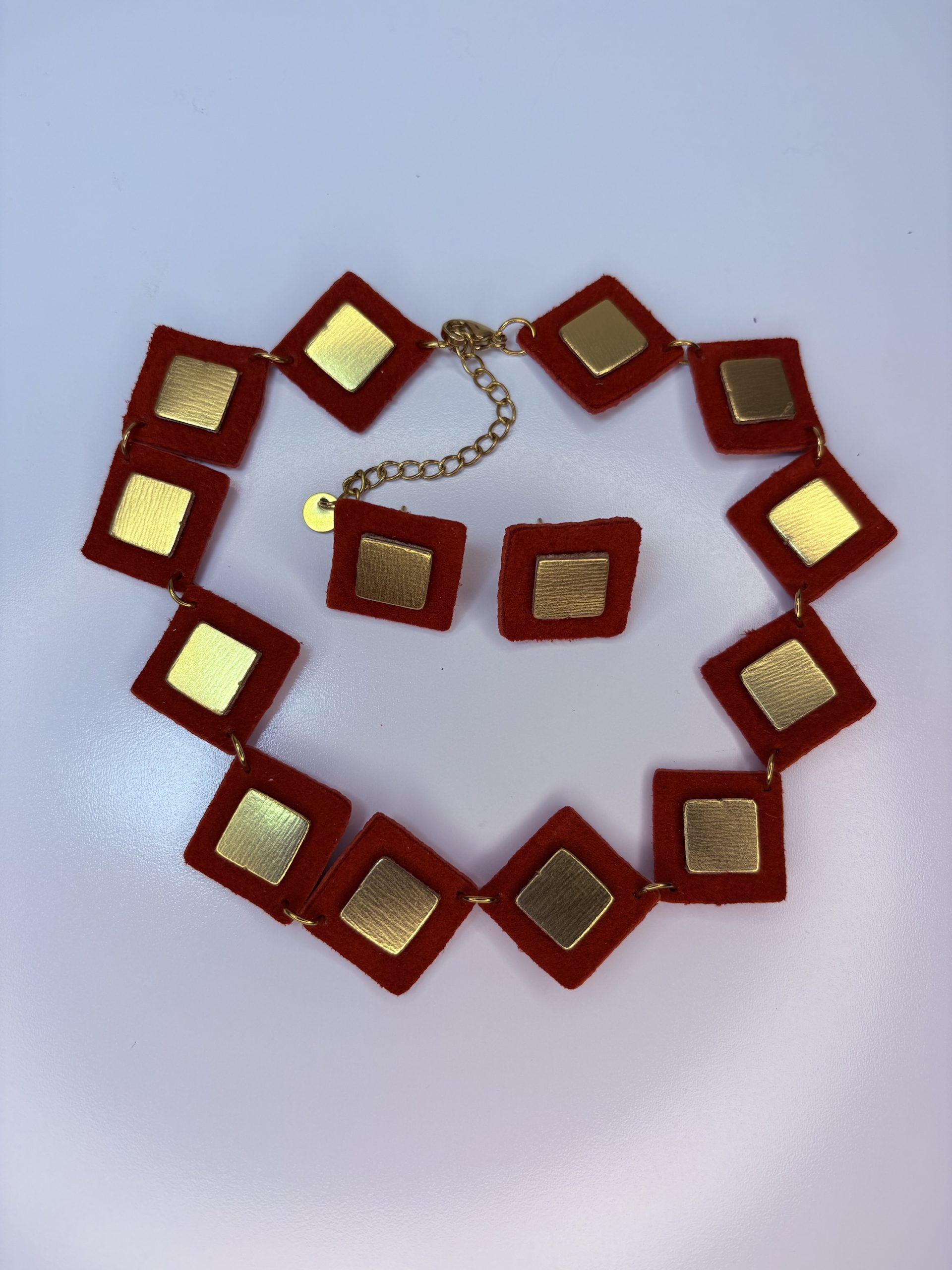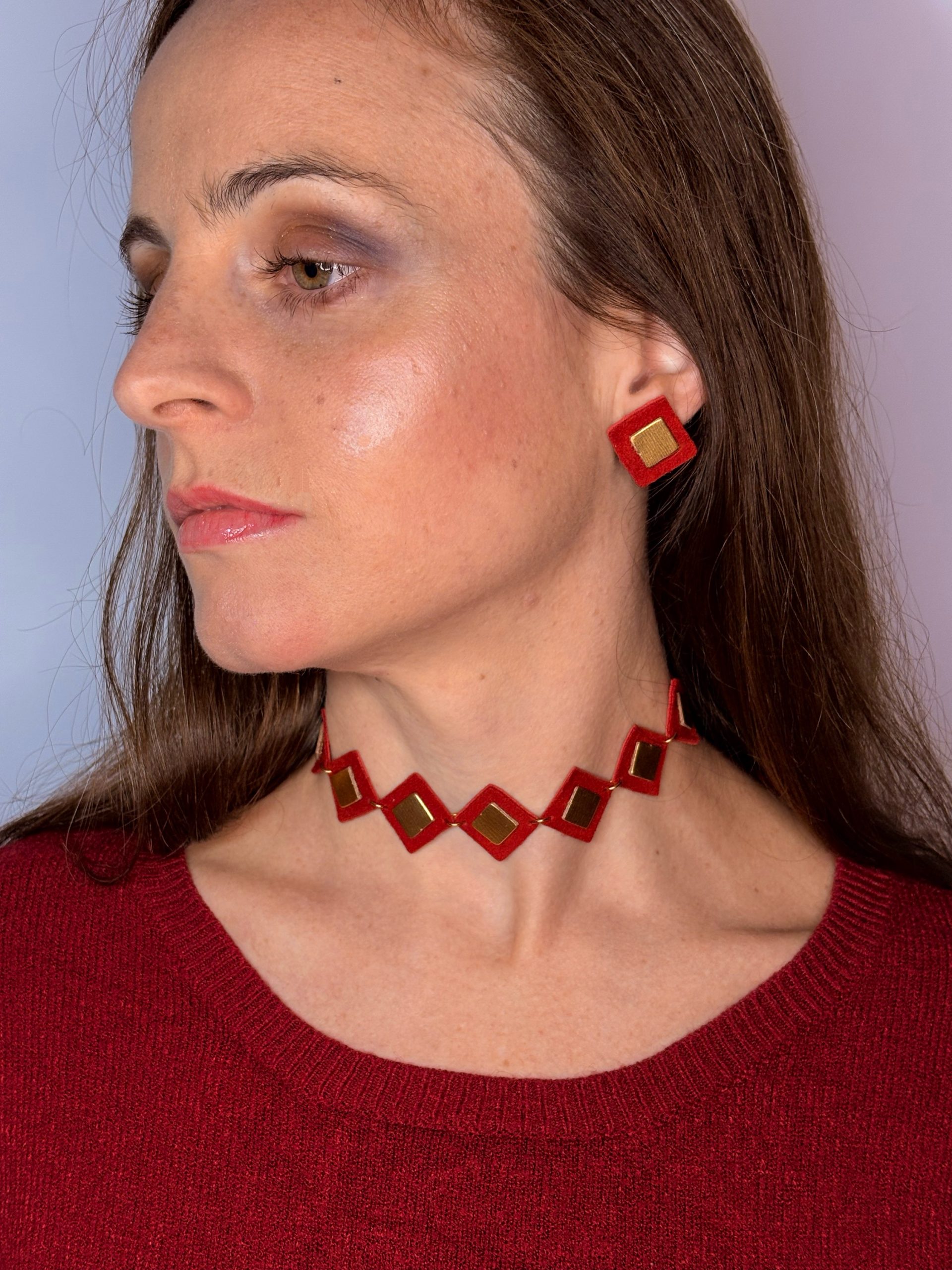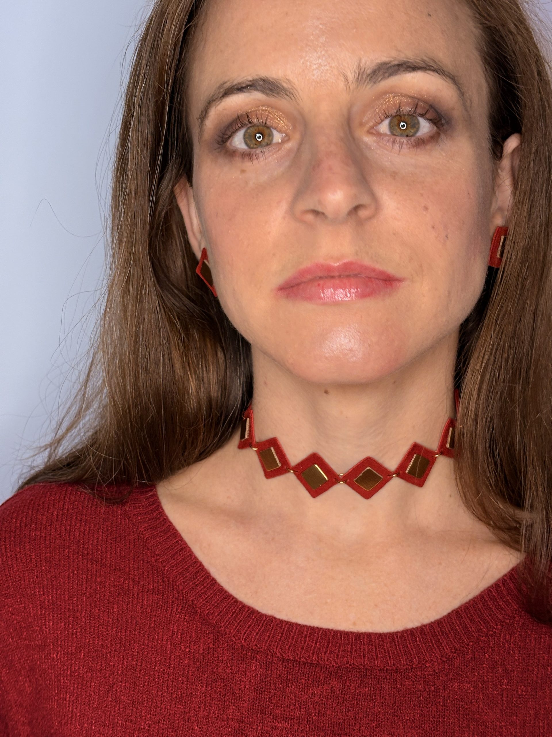 Conjunto de gargantilla y pendientes de diseño en piel en rojo escarlata y oro que se hace a su vez colgante en Y. Un accesorio doble absolutamente único con el que deslumbrarás estas navidades. Hecho a mano en España.