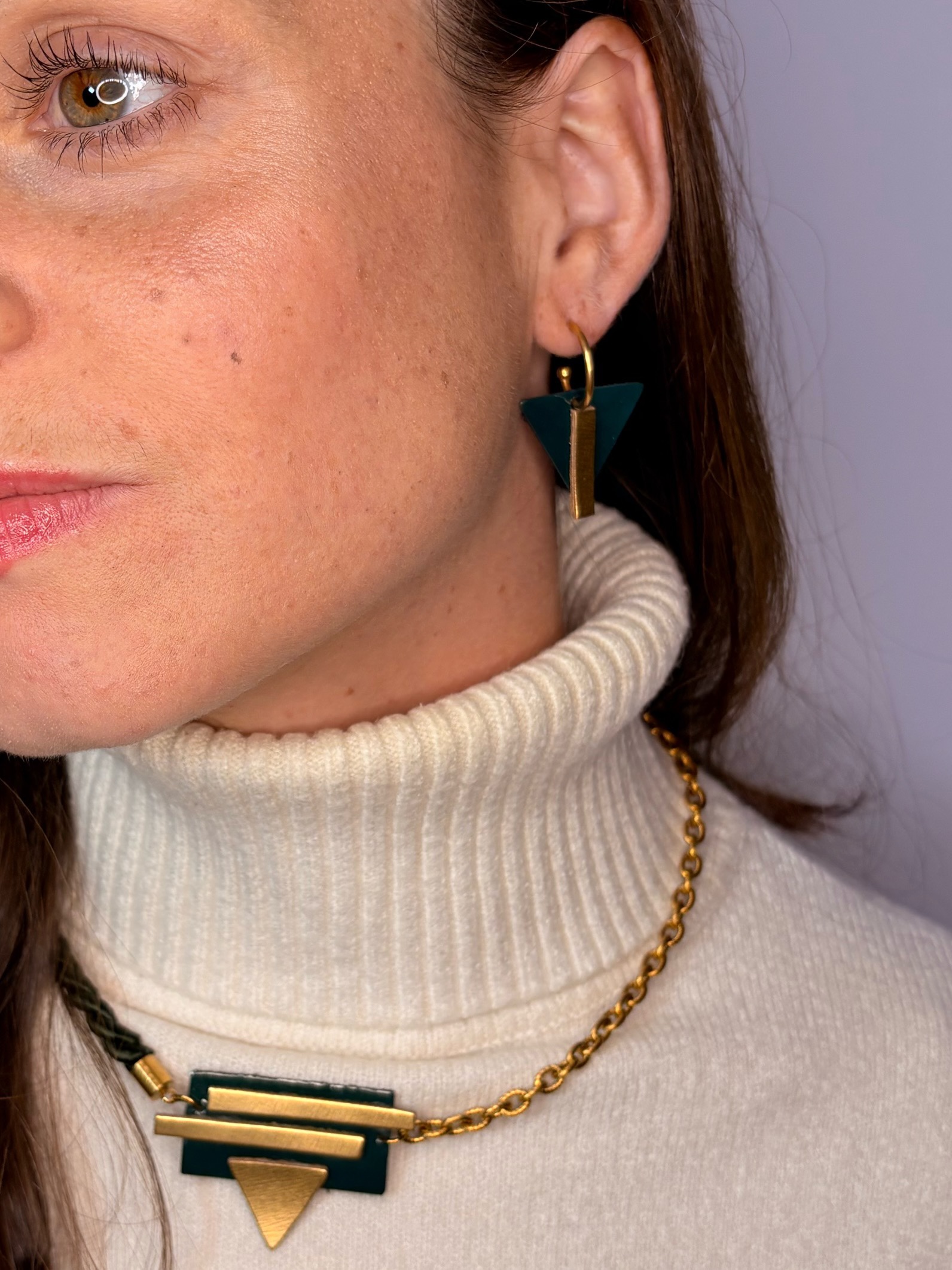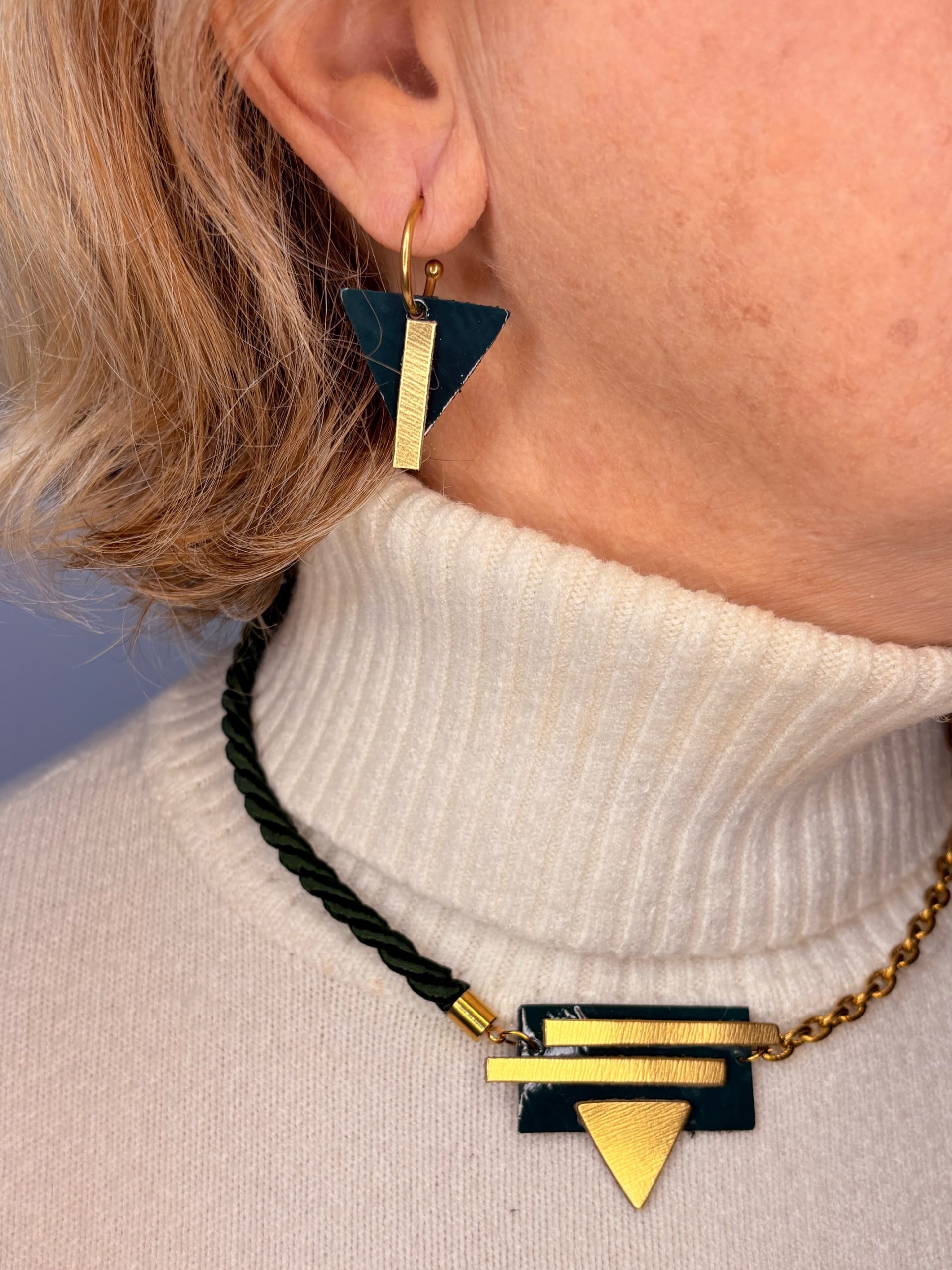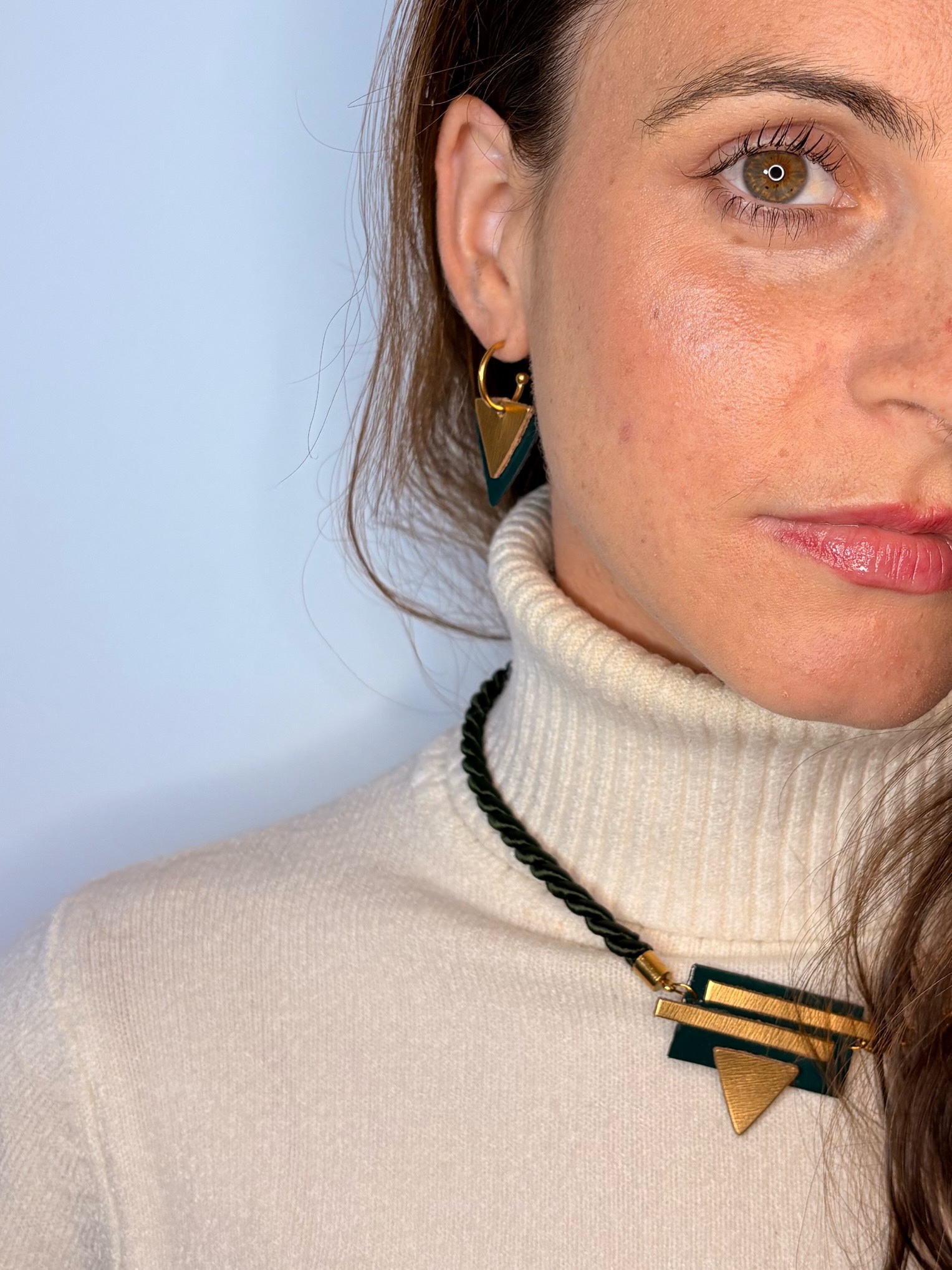 Confeccionados a mano en piel esmeralda y dorado, estos pendientes y colgante de la colección de Otoño «Asimétrica» son una oda al otoño, desde una perspectiva abstracta y exclusiva que caracteriza a nuestra marca.