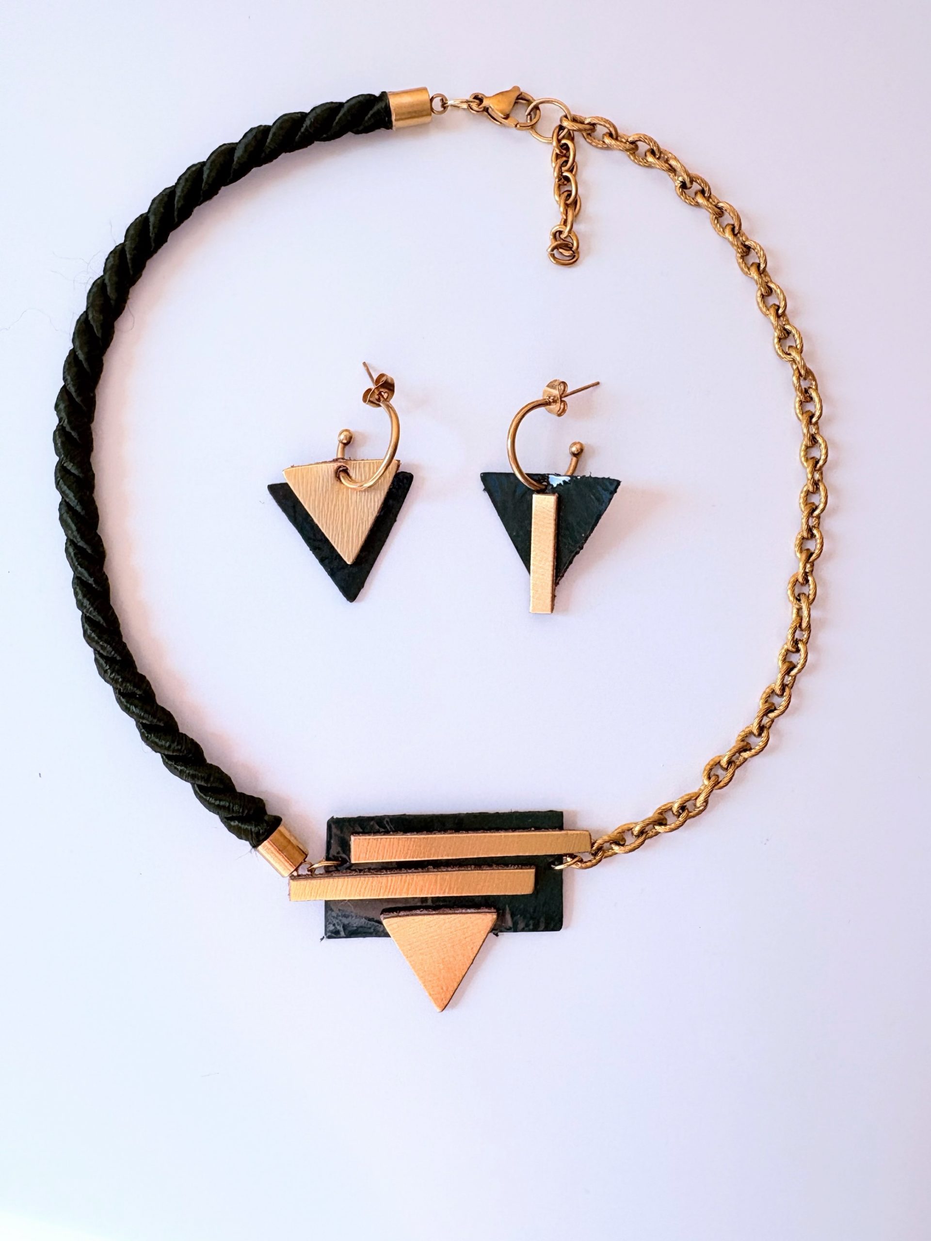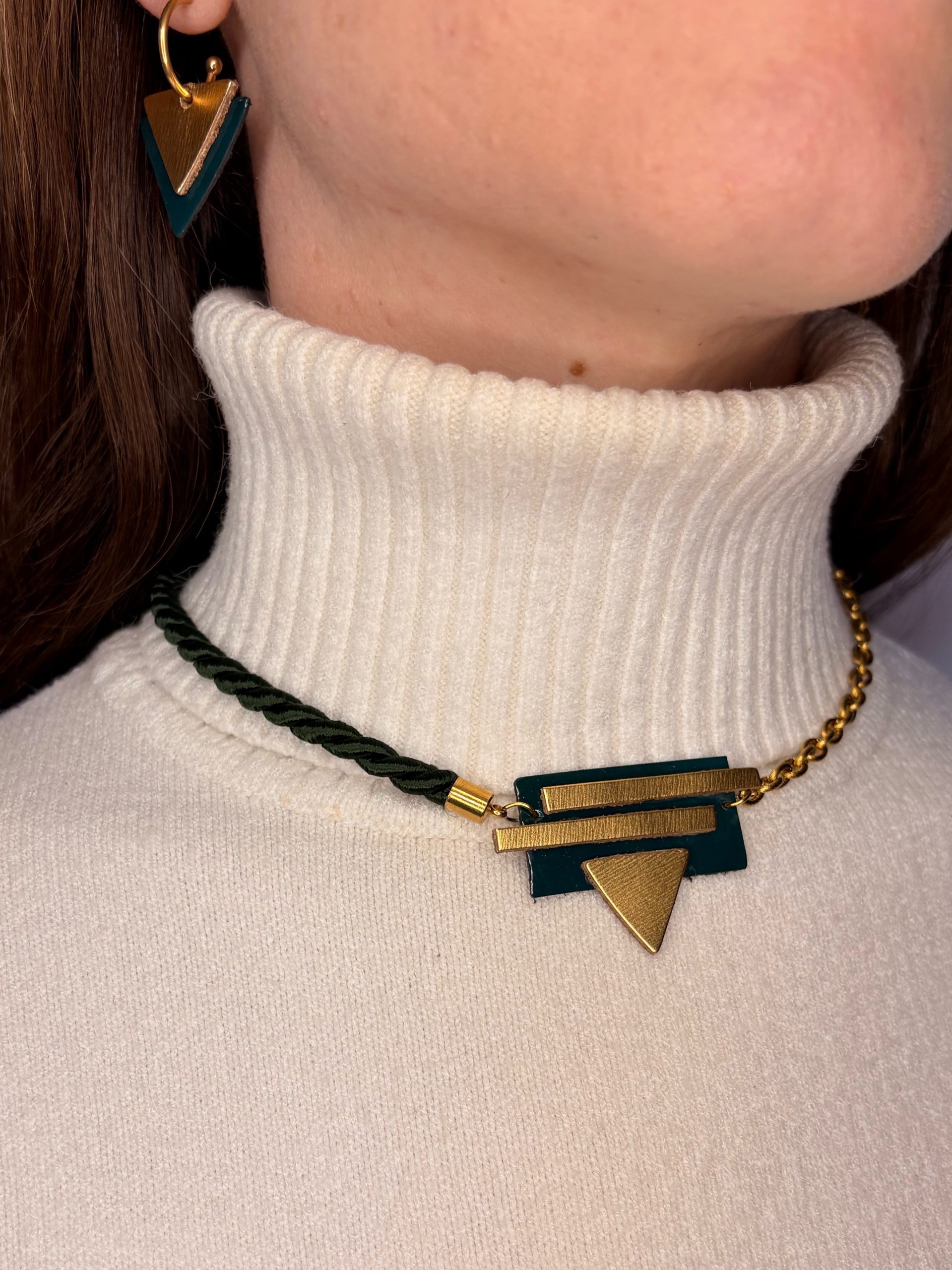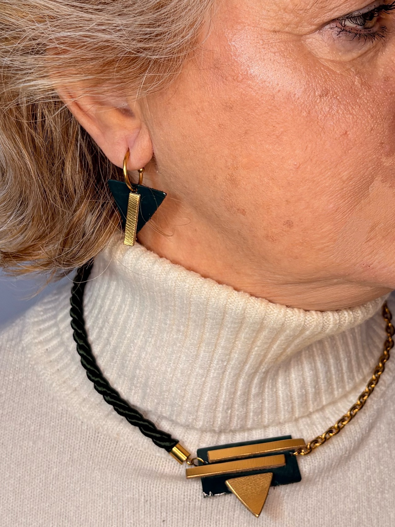 Confeccionados a mano en piel esmeralda y dorado, estos pendientes y colgante de la colección de Otoño «Asimétrica» son una oda al otoño, desde una perspectiva abstracta y exclusiva que caracteriza a nuestra marca.